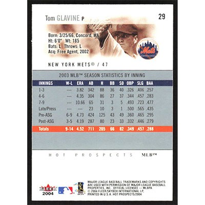 This is a 2004 Hot Prospects Draft Tom Glavine baseball card. The card is #29 and pictures show condition.