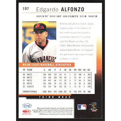 This is a 2004 Leaf Edgardo Alfonzo baseball card. The card is #197 and pictures show condition.