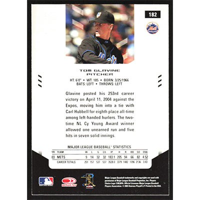 This is a 2004 Leaf Certified Materials Tom Glavine baseball card. The card is #182 and pictures show condition.