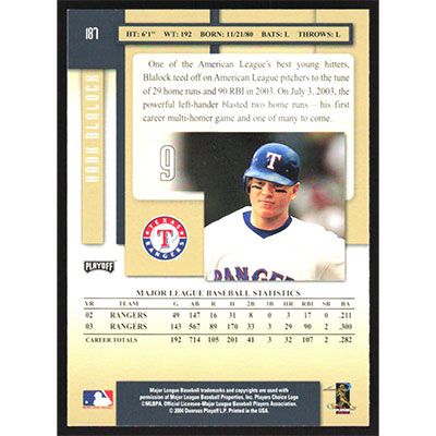 This is a 2004 Playoff Prestige Hank Blalock baseball card. The card is #187 and pictures show condition.