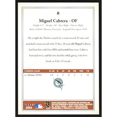 This is a 2004 SkyBox Autographics Miguel Cabrera baseball card. The card is #8 and pictures show condition.