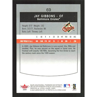 This is a 2004 SkyBox LE Jay Gibbons baseball card. The card is #69 and pictures show condition.