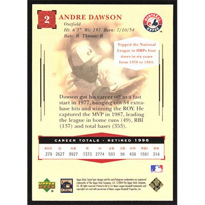 This is a 2004 Sweet Spot Classic Andre Dawson baseball card. The card is #2 and pictures show condition.