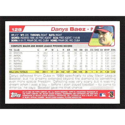 This is a 2004 Topps Danys Baez baseball card. The card is #128 and pictures show condition.