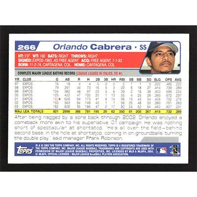 This is a 2004 Topps Orlando Cabrera baseball card. The card is #266 and pictures show condition.