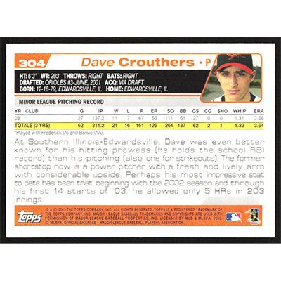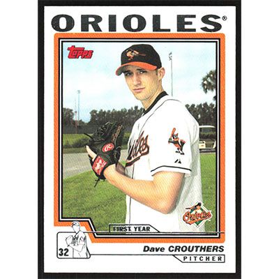 This is a 2004 Topps Dave Crouthers First Year baseball card. The card is #304 and pictures show condition. Team(s): Baltimore Orioles Rookie Card (RC)