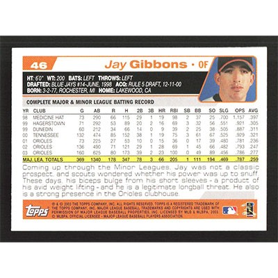 This is a 2004 Topps Jay Gibbons baseball card. The card is #46 and pictures show condition.