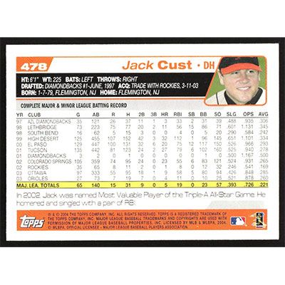 This is a 2004 Topps Jack Cust baseball card. The card is #478 and pictures show condition.
