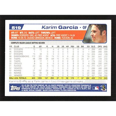This is a 2004 Topps Karim Garcia baseball card. The card is #519 and pictures show condition.