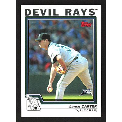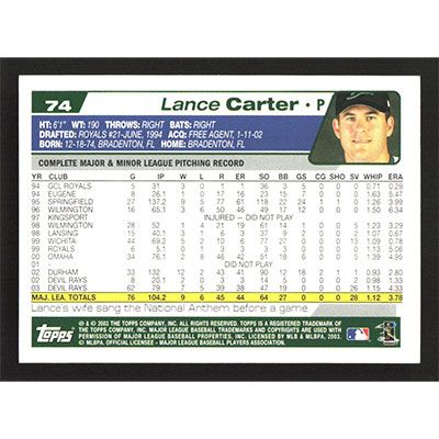 This is a 2004 Topps Lance Carter baseball card. The card is #74 and pictures show condition.