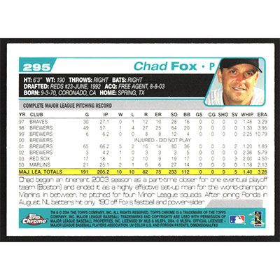 This is a 2004 Topps Chrome Chad Fox baseball card. The card is #295 and pictures show condition.