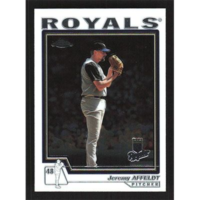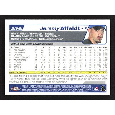 This is a 2004 Topps Chrome Jeremy Affeldt baseball card. The card is #376 and pictures show condition.