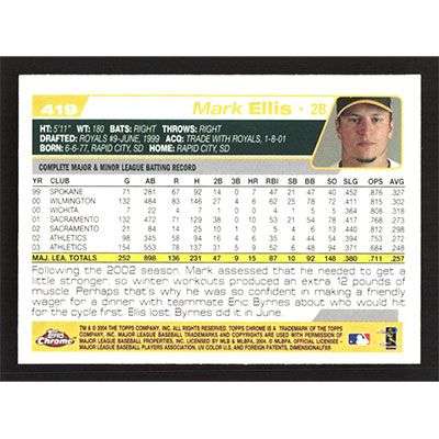 This is a 2004 Topps Chrome Mark Ellis baseball card. The card is #419 and pictures show condition.