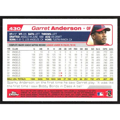 This is a 2004 Topps Chrome Garret Anderson baseball card. The card is #430 and pictures show condition.