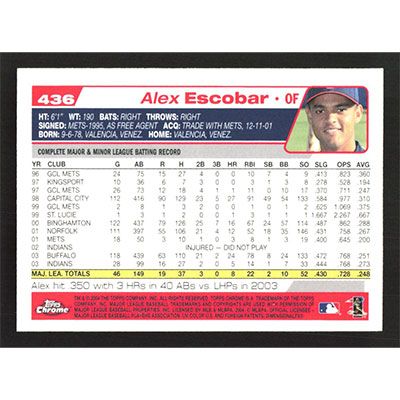 This is a 2004 Topps Chrome Alex Escobar baseball card. The card is #436 and pictures show condition.