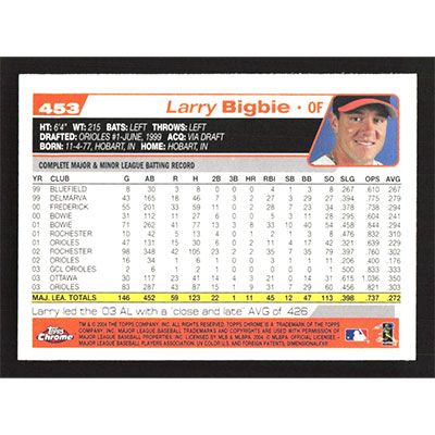 This is a 2004 Topps Chrome Larry Bigbie baseball card. The card is #453 and pictures show condition.