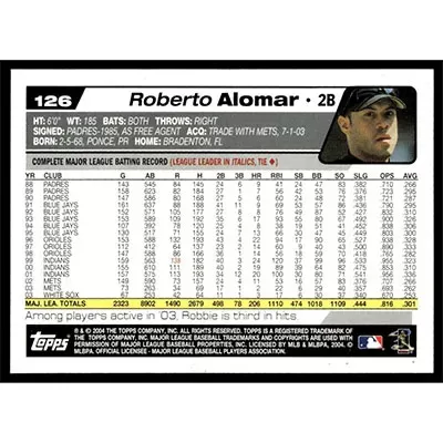 This is a 2004 Topps Opening Day Roberto Alomar baseball card. The card is #126 and pictures show condition.
