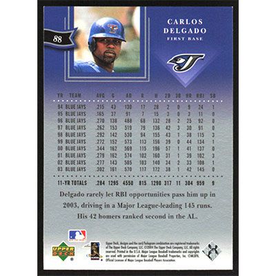 This is a 2004 UD Diamond Collection All-Star Silver Honors Carlos Delgado baseball card. The card is #88 and pictures show condition. Team(s): Toronto Blue Jays