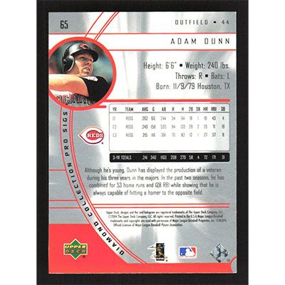 This is a 2004 UD Diamond Collection Pro Sigs Adam Dunn baseball card. The card is #65 and pictures show condition.