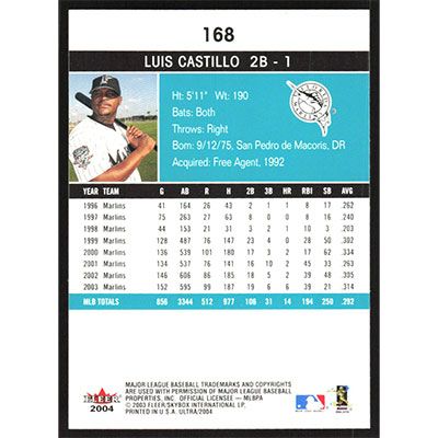 This is a 2004 Ultra Luis Castillo baseball card. The card is #168 and pictures show condition.