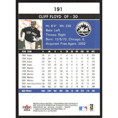 This is a 2004 Ultra Cliff Floyd baseball card. The card is #191 and pictures show condition.