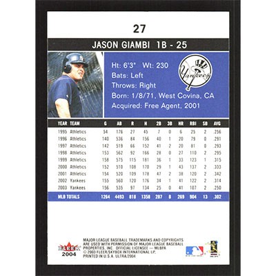 This is a 2004 Ultra Jason Giambi baseball card. The card is #27 and pictures show condition.