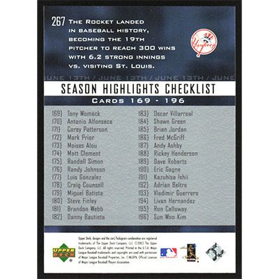 This is a 2004 Upper Deck Roger Clemens Season Highlights Checklist baseball card. The card is #267 and pictures show condition. Team(s): New York Yankees