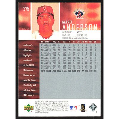 This is a 2004 Upper Deck Garret Anderson baseball card. The card is #275 and pictures show condition.