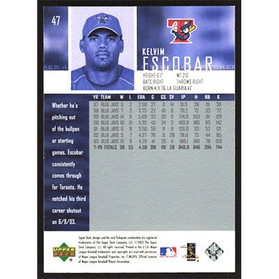 This is a 2004 Upper Deck Kelvim Escobar baseball card. The card is #47 and pictures show condition.