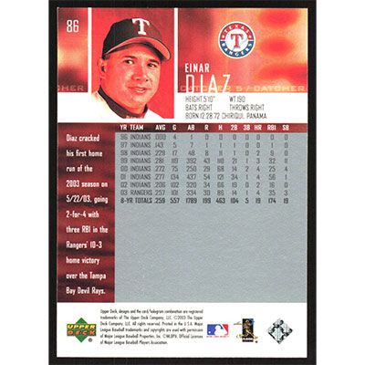 This is a 2004 Upper Deck Einar Diaz baseball card. The card is #86 and pictures show condition.