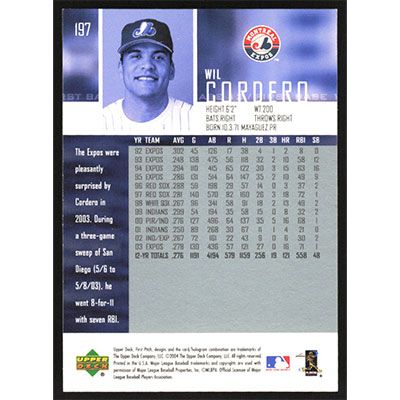 This is a 2004 Upper Deck First Pitch Wil Cordero baseball card. The card is #197 and pictures show condition.