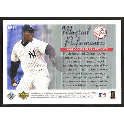 This is a 2004 Upper Deck Magical Performances Jose Contreras Two Hits baseball card. The card is #MP41 and pictures show condition. Team(s): New York Yankees