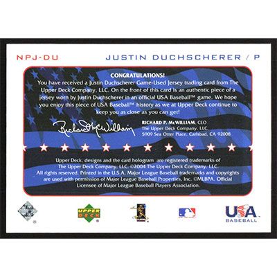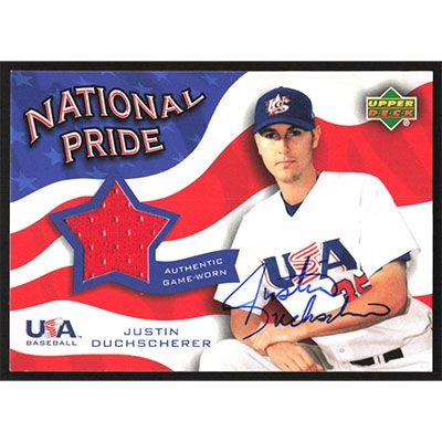 This is a 2004 Upper Deck National Pride Memorabilia 2 Justin Duchscherer Jersey autographed baseball card. This card has been signed, in blue, by Justin Duchscherer, and is guaranteed authentic by Ballcardz.com. The card is #NPJ-DU and pictures show condition.