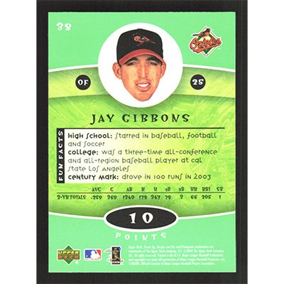 This is a 2004 Upper Deck Power Up Jay Gibbons baseball card. The card is #38 and pictures show condition.