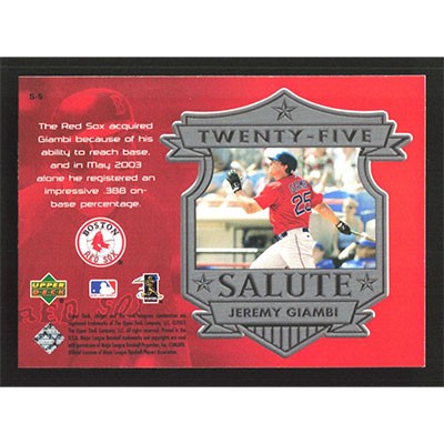 This is a 2004 Upper Deck Twenty-Five Salute Jeremy Giambi baseball card. The card is #S-5 and pictures show condition.