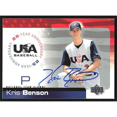 This is a 2004 USA Baseball 25th Anniversary Kris Benson autographed baseball card. This card has been signed, in blue, by Kris Benson, and is guaranteed authentic by Ballcardz.com. The card is #USA-14 and pictures show condition.