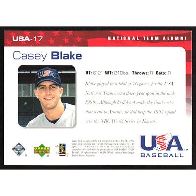 This is a 2004 USA Baseball 25th Anniversary Casey Blake autographed baseball card. This card has been signed, in blue, by Casey Blake, and is guaranteed authentic by Ballcardz.com. The card is #USA-17 and pictures show condition.