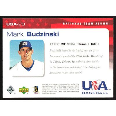 This is a 2004 USA Baseball 25th Anniversary Mark Budzinski autographed baseball card. This card has been signed, in blue, by Mark Budzinski, and is guaranteed authentic by Ballcardz.com. The card is #USA-28 and pictures show condition.