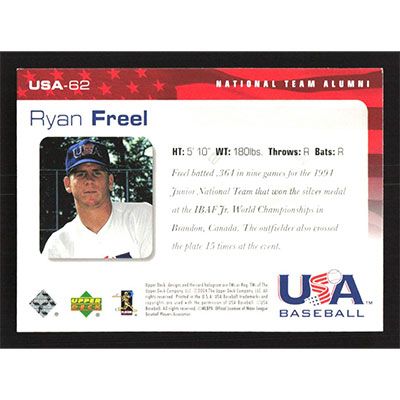 This is a 2004 USA Baseball 25th Anniversary Ryan Freel autographed baseball card. This card has been signed, in blue, by Ryan Freel, and is guaranteed authentic by Ballcardz.com. The card is #USA-62 and pictures show condition.
