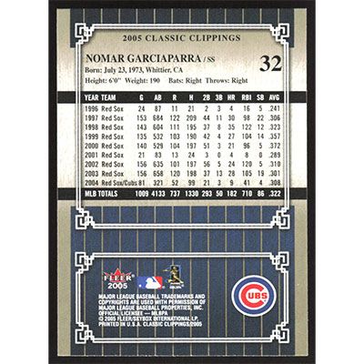 This is a 2005 Classic Clippings Nomar Garciaparra baseball card. The card is #32 and pictures show condition.