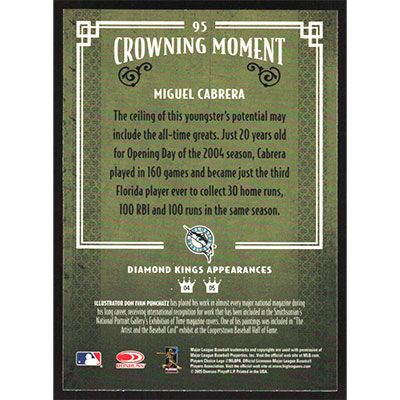 This is a 2005 Diamond Kings Miguel Cabrera baseball card. The card is #95 and pictures show condition.
