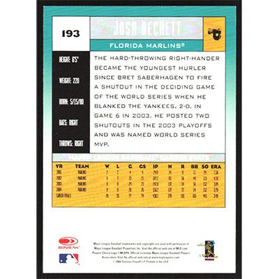 This is a 2005 Donruss Josh Beckett baseball card. The card is #193 and pictures show condition.