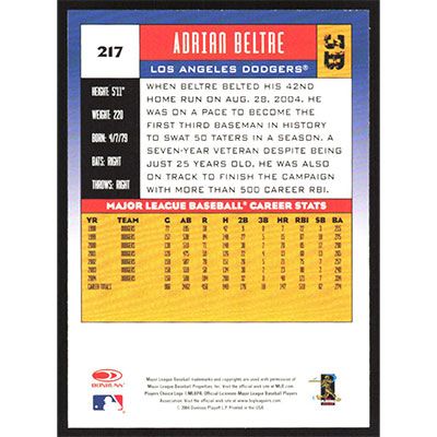 This is a 2005 Donruss Adrian Beltre baseball card. The card is #217 and pictures show condition.