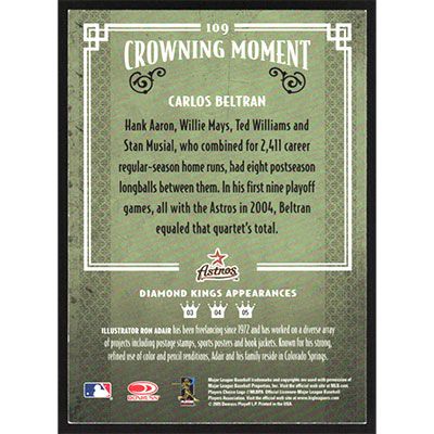 This is a 2005 Donruss Diamond Kings Carlos Beltran baseball card. The card is #109 and pictures show condition.