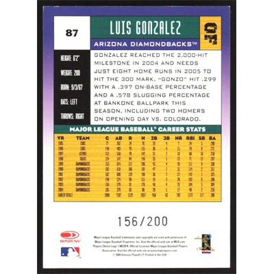 This is a 2005 Donruss Press Proofs Red Luis Gonzalez baseball card. The card is #87 and pictures show condition. This card is limited; #'d 156/200. Team(s): Arizona Diamondbacks