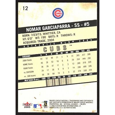 This is a 2005 Fleer Authentix Nomar Garciaparra baseball card. The card is #12 and pictures show condition.