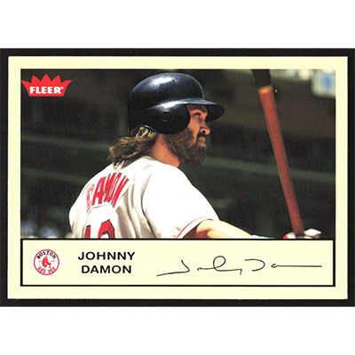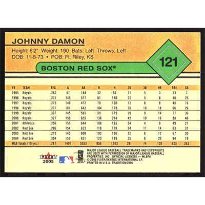 This is a 2005 Fleer Tradition Johnny Damon baseball card. The card is #121 and pictures show condition.