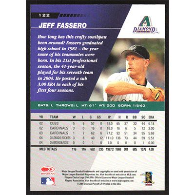 This is a 2005 Leaf Jeff Fassero baseball card. The card is #122 and pictures show condition.