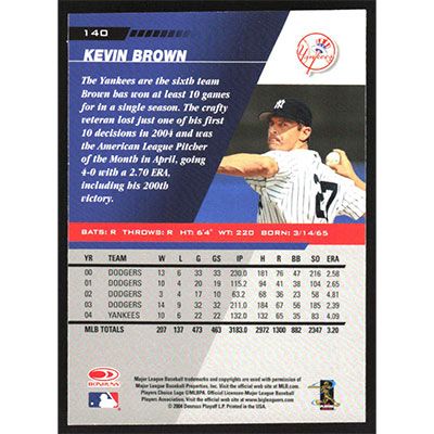 This is a 2005 Leaf Kevin Brown baseball card. The card is #140 and pictures show condition.