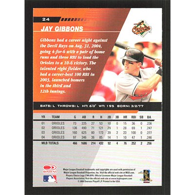 This is a 2005 Leaf Jay Gibbons baseball card. The card is #24 and pictures show condition.